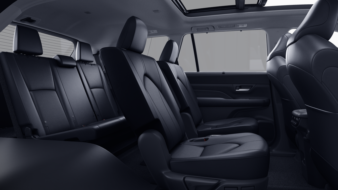 • 7-passenger seating with second-row fold-down captain's chairs and fold-down inboard armrests, adjustable headrests and two cup holders mounted on the floor; and 60/40 split, fold-down third-row seats with sliding headrests and recline function